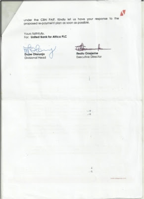 That request to have his repayment suspended was a red flag. It signaled that Jimoh Ibrahim had neither intention nor will to honor his obligations. UBA served Air Nigeria notice that the airline could not stop repayment of the loan (see attached letter).
