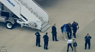 His hands were zip-tied behind his back as he was led out of the flight onto the tarmac, where several police vehicles and ambulance were waiting. He was wearing a dark hooded jacket and a blue shirt.