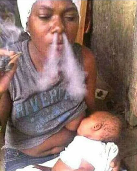 She is breastfeeding the baby Igbo! If the baby becomes a drug addict in future, she won't blame herself but witches in the family! If you see such women in action like this, call the police.