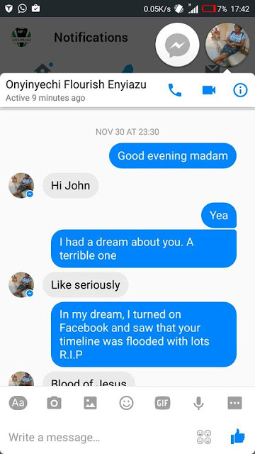 "It's really unfortunate that the spiritual controls the physical. John Kpoobari Diidi had a revelation about Onyinyechi Flourish Enyiazu, he inboxed her and they had the conversations. Who would have thought the dream was going to be real? Yesterday she uploaded that she had a successful surgery and today she is no more, that revelation John had has come to pass.