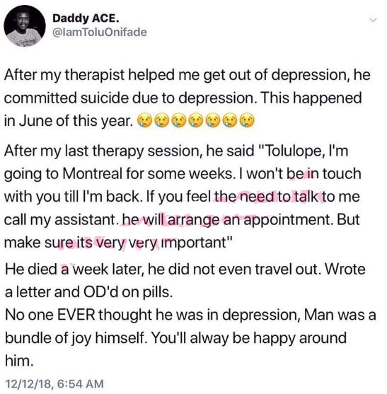 According to Tolulope, he was depressed and went to the therapist to seek help. The therapist was apparently good and successfully helped him overcome his depression. However, tragedy happened just days later.