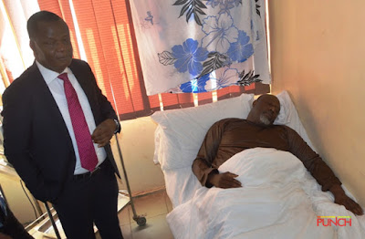 Embattled senator Dino Melaye has been pictured in a hospital on Monday where he is receiving treatment after collapsing when he was arrested by police.